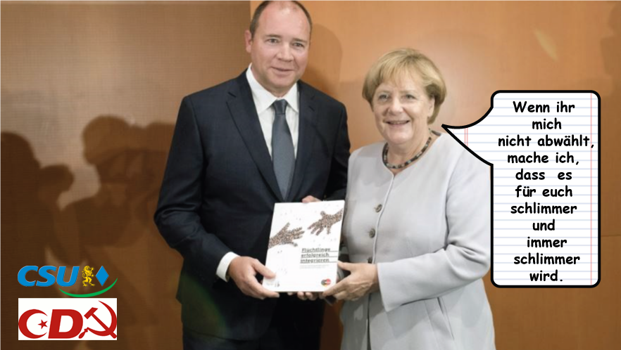 So wie eingangs schon erwähnt baut die ganze Initiative „Wir zusammen“ auf Gesetzlosigkeit und ökonomischem Unsinn auf. Der wahre Zweck der Initiative ist eine Gängelung und Kontrolle der deutschen Wirtschaft sowie politische Propaganda für das Lieblingskind der kinderlosen Kanzlerin Angela Merkel, für ihre „Flüchtlinge“, die sich zu Unrecht in unserem Land aufhalten (Dublin; GG Art. 16a, 2). Dass es Propaganda ist, sieht man bereits am Namen des Netzwerkes, wenn im Logo hinter dem „Wir“ noch abgesetzt „tschaft“ auftaucht: „Wirtschafft zusammen“, heißt es da, sodass eine unterbewusste Assoziation mit Merkels „Wir schaffen das“ hergestellt wird, das ja tatsächlich und eigentlich beworben wird.