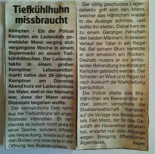 Kempten: Tiefkühlhähnchen vergewaltigt.