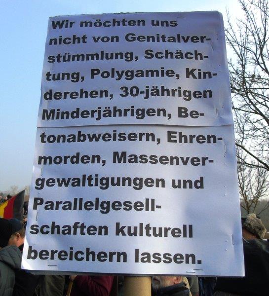 Wir wollen nicht, dass unsere Töchter tagein tagaus von diesen primitiven Ficki-Ficki-Typen belästigt und bedrängt werden. Wir wollen nicht, dass der Heimweg von den Schulen für unsere Kinder zum Spießrutenlauf wird. Es ist ein Verbrechen, dass man dieses Klientel ins Land gelassen hat und es ist ein Verbrechen, was man Mia, Maria und all den anderen jungen Dingern angetan hat, die weder von ihren Familien noch von Lehrern oder Pfarrern gewarnt wurden, was das mehrheitlich für Typen sind. Ich könnte heulen, wenn ich an Mia denke und wie dieser Dreckskerl sie im Drogeriemarkt massakriert hat.