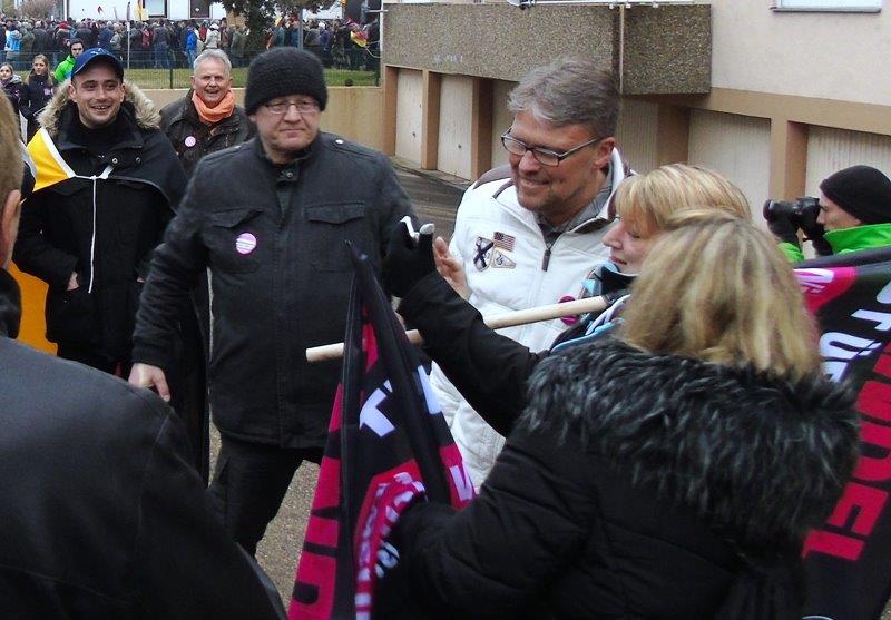 Am Rande der Demo machte sich Guido Reil (Mitglied des Bundesvorstandes der AfD) ein Bild von der Demonstration und erntete reihenweise Sympathiebekundungen in Form von „Guido, Guido“-Rufen, Schulterklopfern, Gruppenbildern mit ihm und allgemein viel Zuspruch zu seiner Person.