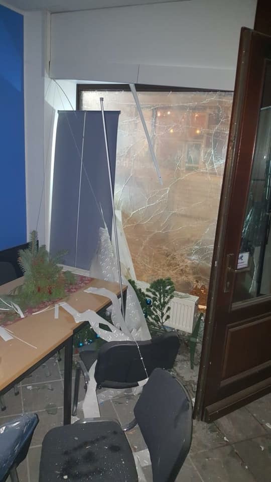 Sagt mal, ist das eigentlich Panzerglas im Bürgerbüro, dass das, obwohl völlig zersplittert, immer noch steht wie eine deutsche Eiche? Das wird Zeckenbiss aber gewiss nicht gefallen, dass die sich daran die Zähne ausgebissen haben. Im Nachbarhaus nebenan hat es dem Video nach die Fenster hingegen weg gerissen und jemanden getroffen, der eher nach linkem und armen Klientel aussieht.