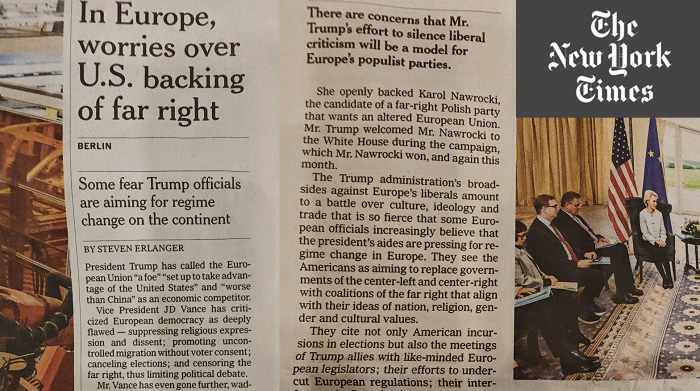Die linksdominierten US-Medien überschlagen sich wieder einmal in Panikmeldungen. Die New York Times warnt in ihrer Printausgabe von Freitag in einem langen Artikel davor, dass Präsident Donald Trump und sein Vize JD Vance rechte und patriotische Bewegungen in Europa unterstützen. Für die transatlantische Presse ist das natürlich ein „Skandal“, für Millionen Bürger in Europa dagegen ein Hoffnungsschimmer.