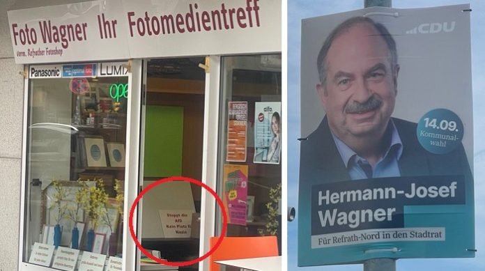Ganz ohne Nazis geht es dann aber doch nicht, wenn man politisch nichts zu bieten hat. Wagner führt seit über 40 Jahren in Refrath einen Fotoladen mit dem modernen Namen „Foto Wagner. Ihr Fotomedientreff“. Da wirbt der Christdemokrat mit dem, was heute in ist, nämlich mit dem Verbot der AfD. Das seien Nazis, wie er allen mitteilt, die seinen Laden betreten. Mit folgendem Wortlaut auf seinem Schild begrüßt der Chef seine Kunden: