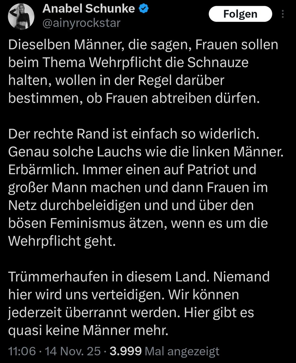 „In diesem Video reagiere ich auf die Aussage von Anabel Schunke, die deutsche Männer als „Lappen“ bezeichnet, wenn sie nicht in den Krieg ziehen wollen.