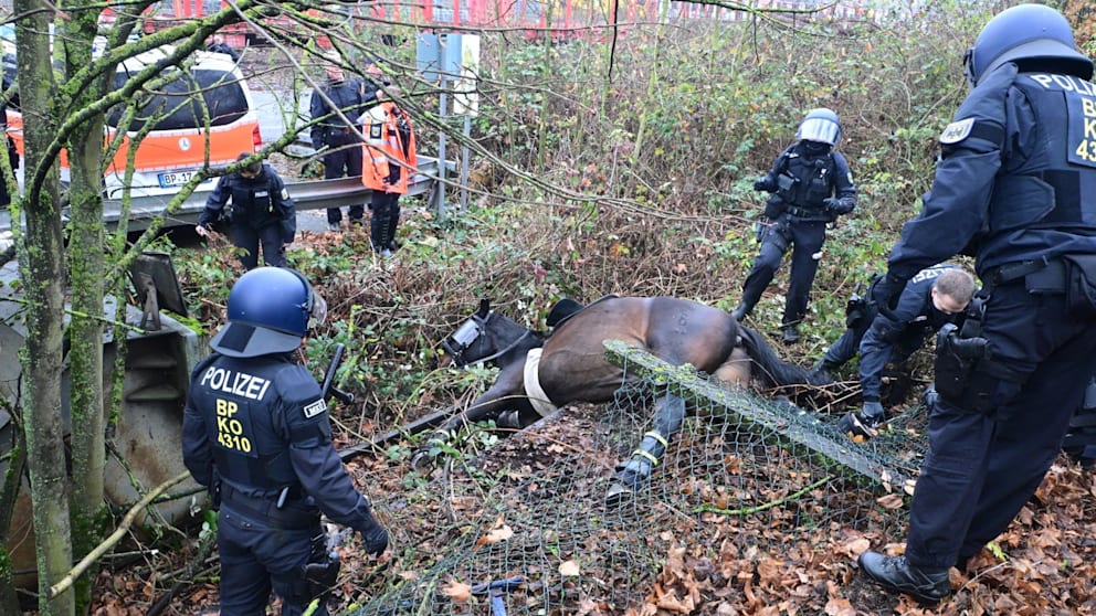 Dann sei es auch schon passiert: „Ein Pferd stürzte samt Polizistin rückwärts die Böschung herunter – ohne Fremdeinwirkung.“ Auf X wurde später ohne Anhaltspunkte verbreitet, auf die Pferde seien Steine geworfen worden. Davon ist auch der Polizei nichts bekannt.