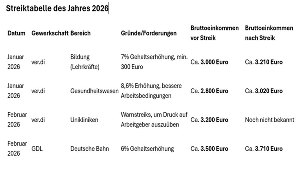 - Gesundheitswesen: Ebenfalls im Januar 2026 rief ver.di zu Streiks im Gesundheitssektor auf, wo eine Erhöhung um 8,6 Prozent gefordert wurde. Das ursprüngliche Einkommen betrug rund 2800 Euro.
