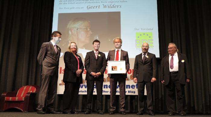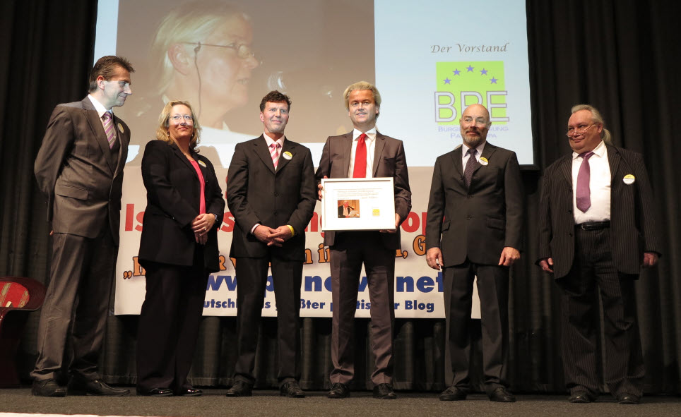 Auf diesem Foto ist rechts neben Wilders der Gründer, langjährige Vorsitzende und jetzige Präsident der BPE, Willi Schwend, zu sehen. Neben ihm der langjährige Geschäftsführer und bis heute eine der guten Seelen des Vereins, Conny Axel Meier. Ganz links der langjährige Vereinsvorsitzende René Stadtkewitz, neben ihm Elisabeth Sabaditsch-Wolff, die für die BPE seit vielen Jahren an Konferenzen im Ausland teilnimmt, beispielsweise bei der Organisation für Sicherheit und Zusammenarbeit in Europa (OSZE). Neben ihr der PI-NEWS-Gründer Stefan Herre, der an diesem Tag auch die Laudatio auf Geert Wilders anläßlich der Preisverleihung hielt.